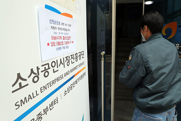 서울 종로구 소상공인시장진흥공단 중부센터로 한 시민이 들어가고 있다. (사진=(c) 연합뉴스)손병두 금융위원회 부위원장은 이날 모두발언에서 “사회적 거리두기가 지속되면서 서민경제와 자영업자 분들의 어려움이 더 커지고 있다”고 밝혔다.