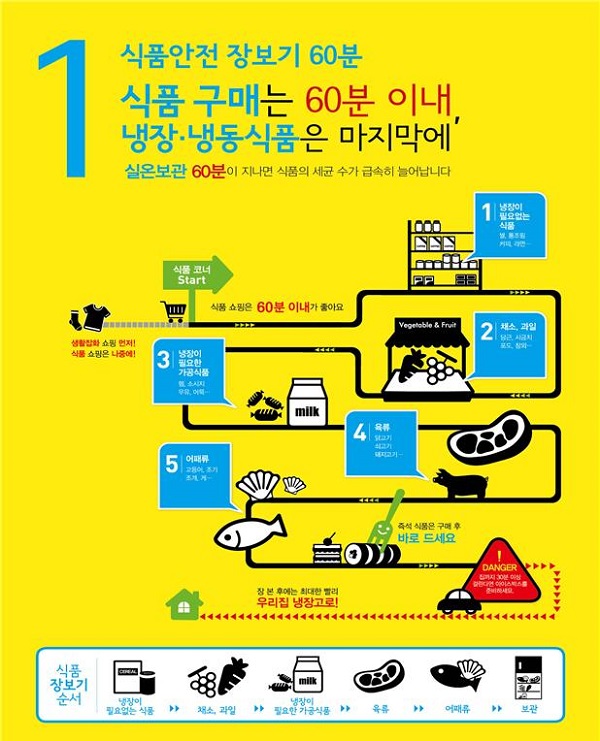 대형 할인마트나 백화점 등에서 장보는 시간은 평균 80분 정도(1회 평균)로 장바구니에 담은 식품이 상온에서 오랜 시간 방치될 경우 세균 증식의 우려가 있으므로 상하기 쉬운 어패류와 냉장·냉동식품은 마지막에 구입하도록 한다.