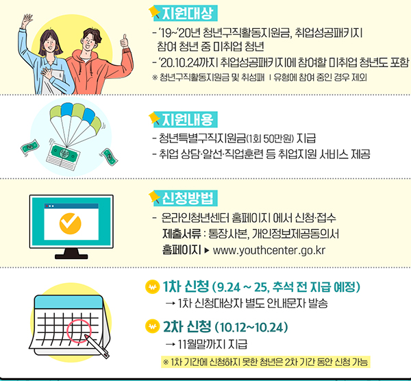 코로나19로 인한 채용 축소·연기, 구직기간 장기화 등 청년층의 어려운 취업여건을 감안해 청년특별구직지원금(1회 50만원)을 지원한다.