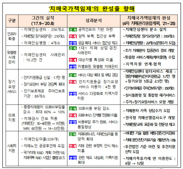 정부는 지난 세 번의 치매관리종합계획과 2017년 9월에 발표된 ‘치매국가책임제’의 과제를 통해 치매 관련 기반시설을 확충하고 있으며, 의료·요양 제도개선을 통해 치매 환자와 가족의 부담을 지속적으로 줄여가고 있다.