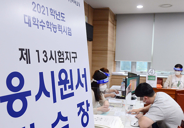 올해 12월 3일 시행되는 2021학년도 대학수학능력시험 응시원서 접수가 시작된 3일 서울 남부교육지원청에서 한 수험생이 응시 원서를 제출하고 있다. (사진=(c) 연합뉴스)교육부는 질병관리청, 한국교육과정평가원과 합동 상황관리반을 운영해 시도별 수능지원자의 확진과 격리 추이, 규모를 지속적으로 점검하고 시기별로 위험요소를 진단하며 상황을 종합관리하면서 중대본을 통해 유관부처와 공동 대응할 방침이다.