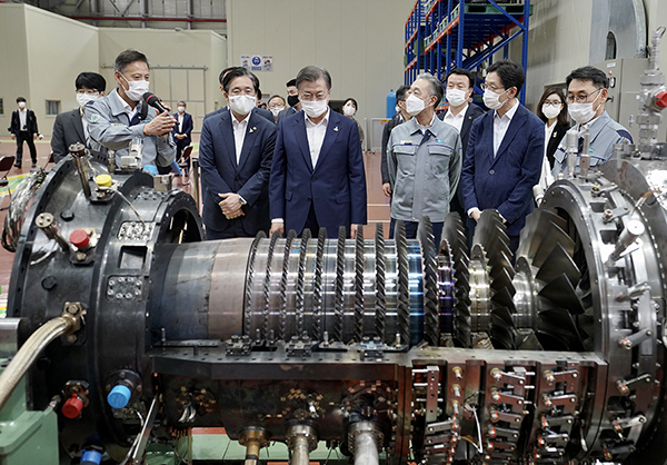 문재인 대통령이 지난 17일 그린 뉴딜 현장인 경남 창원시 두산중공업을 방문, 가스터빈 고온부품공장을 시찰하고 있다. (사진=청와대)