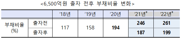 ▲ 6500억원 출자 전후 부채비율 변화