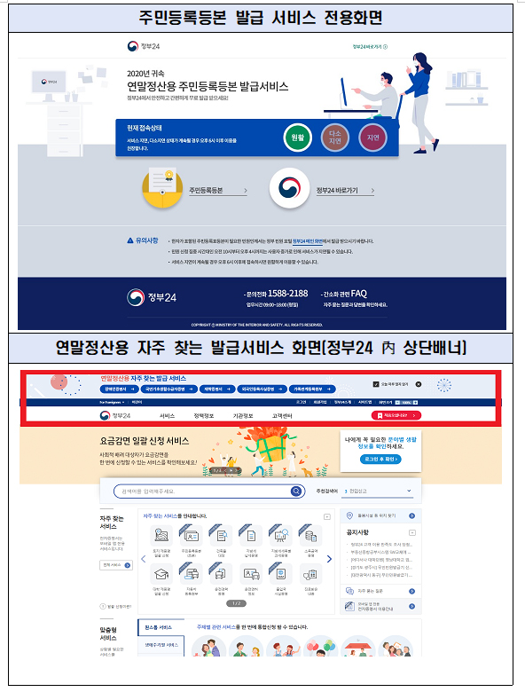 박덕수 행안부 행정서비스통합추진단장은 “코로나로 어려움을 겪고 있는 직장인들이 13월의 월급이라 불리는 연말정산을 불편함 없이 마무리할 수 있게 ‘정부24’ 연말정산용 주민등록등본 발급서비스 제공에 차질이 없도록 하겠다”고 밝혔다.