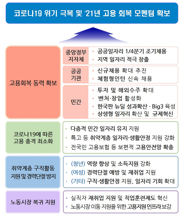 고용위기 극복을 위한 공공부문의 적극적 역할을 강화하고 규제 혁신·투자환경 개선 등을 통해 양질의 민간 일자리 창출 여건을 조성하며 고용 효과가 큰 벤처·창업 활성화에도 적극 나선다.