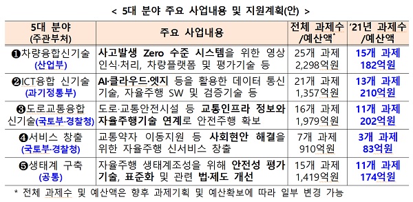 정부는 2027년 차량 주행과 교통 인프라·서비스를 아우르는 ‘융합형 레벨4 완전자율주행’의 기반을 완성한다는 목표로 ▲차량융합 신기술 ▲ICT융합 신기술 ▲도로교통융합 신기술 ▲서비스창출 ▲생태계 구축 등 5대 분야에서 84개 세부과제를 지원한다.