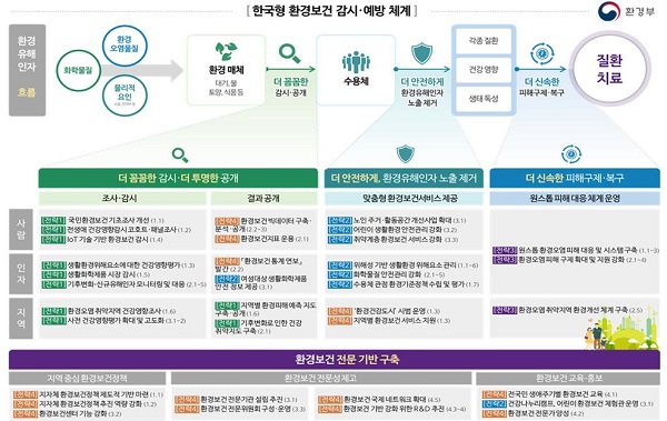 아울러 난개발·교통 밀집지역 등에 대한 건강영향조사를 확대하고 빅데이터를 토대로 지역별 환경피해 예측 지도를 작성하는 등 취약지역에 대한 환경·건강감시 또한 강화된다.
