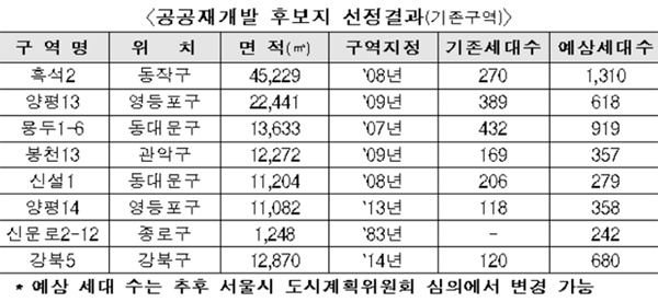 선정위원회는 이번에 선정되지 않은 4곳도 공공재개발 사업의 필요성은 인정되나 구역별 현안이 있어 이를 검토 후 차기 선정위원회를 통해 선정여부를 재논의하기로 하고 보류결정했다.