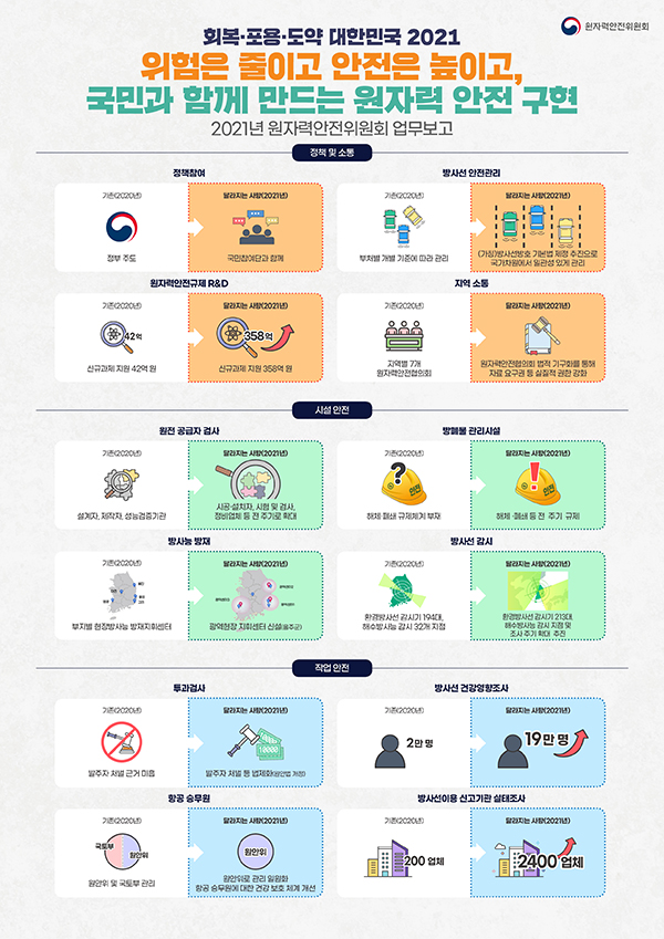 엄재식 원안위원장은 “2011년 설립 이후 원안위의 최우선 가치는 언제나 국민의 생명과 안전”이라며 “원안위는 올해 국민들의 참여를 토대로 원자력 안전정책을 수립하고 방사선으로부터 안전한 작업환경이 조성되도록 근로자 보호 제도를 강화하고 국민들이 방사선에 대한 불안감을 해소할 수 있도록 감시를 강화하겠다”고 밝혔다.