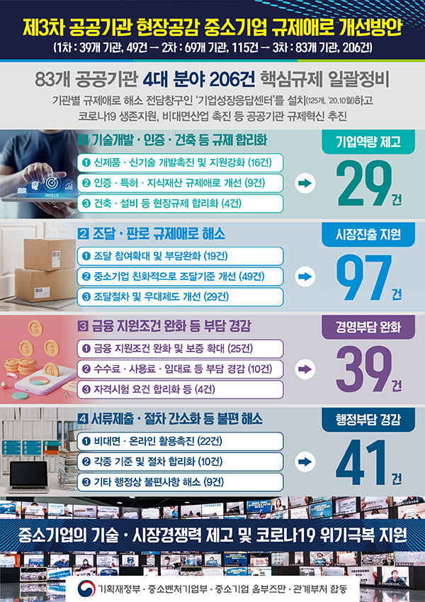 주요 개선 내용은 기술개발·인증·건축 등 규제 합리화, 조달·판로 규제애로 해소, 금융 지원조건 완화, 서류제출·절차 간소화 등이다.