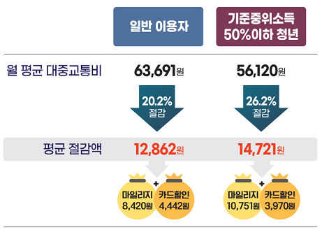 특히 마일리지가 추가로 지급되는 기준중위소득 50% 이하 청년(만 19∼34세)들은 월평균 1만 4721원(마일리지 1만 751원, 카드할인 3970원), 대중교통비의 26.2%를 절감했다.