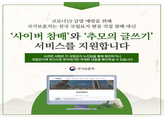 각 국립묘지 누리집에 있는 ‘사이버 추모관’을 통해 직접 방문하지 않고 ‘온라인 참배’와 ‘추모의 글쓰기’ 등을 할 수 있도록 지원한다.