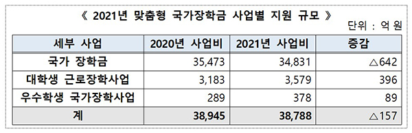 먼저 2021년 근로·우수 장학생 지원 인원을 지난해보다 대폭 확대해 근로 희망학생과 우수 학생의 학업수행을 적극적으로 지원할 방침이다. 이를 위해 지난해 10만 9000명이던 근로 장학생을 올해 12만 명으로 늘리고 3만 1000명이던 우수 장학생도 4만 4000명까지 늘린다.