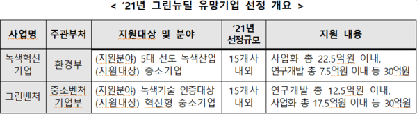양 부처는 지난해 그린뉴딜 유망기업 41개사를 선정한데 이어, 올해 30개사(환경부 15개사, 중기부 15개사)를 추가로 선정할 계획이다.