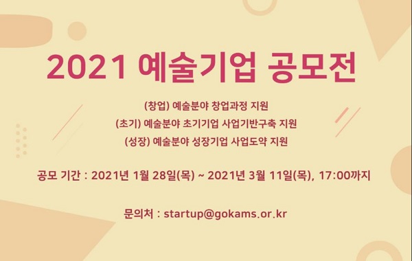 참가를 희망하는 창업자는 내달 11일 오후 5시까지 예술경영지원센터 누리집(www.gokams.or.kr)’을 통해 온라인으로 접수하면 된다. 1차 서류심사와 2차 발표심사를 거쳐 4월 말에 최종 지원 기업을 선정할 계획이다.
