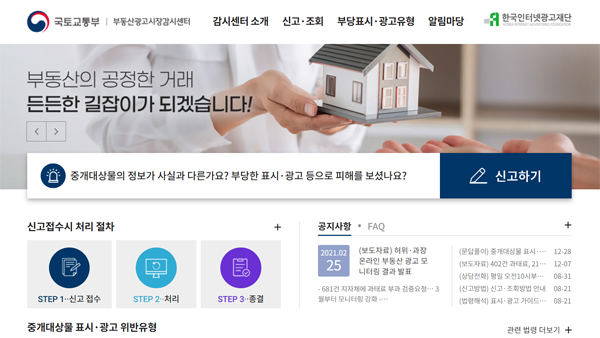 ▲ 한국인터넷광고재단 ‘부동산광고시장감시센터’ 누리집 메인화면.이 중 정상매물이거나 신고 내용으로 위반 여부를 확인하기 곤란한 건을 제외하고 실제 위반이 의심되는 681건에 대해서는 지자체에 최종 검증을 거쳐 과태료를 부과하는 등 법령 위반에 따른 조치를 요구할 예정이다.