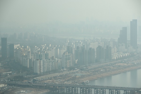 지난 21일 서울 및 경기 지역 미세먼지 농도가 나쁨 수준을 보인 가운데 서울 영등포구 63스퀘어에서 바라본 서울 시내 모습. ((c) 연합뉴스)