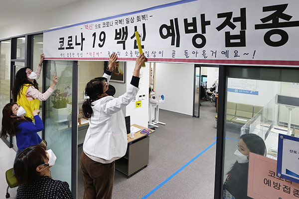 ▲ 24일 서울 중랑구보건소에서 보건소 관계자들과 구청직원들이 코로나19 예방접종 안내 현수막을 설치하고있다.(사진=(c) 연합뉴스)이날 정 반장은 “중증환자가 많이 방문하는 고위험 의료기관과 코로나19 1차 대응요원은 3월 초부터 접종을 받으실 수 있다”고 전했다.