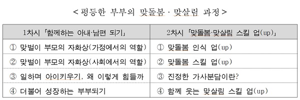 여성가족부와 한국건강가정진흥원은 5일 가족내 성평등한 육아·가사 실천 문화의 일상화를 위해 올해 가족친화교육 온라인 과정에 ‘평등한 부부의 맞돌봄·맞살림 과정’을 신규 개설해 운영한다고 밝혔다.