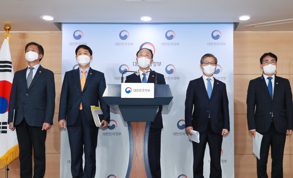 ▲ 홍남기 경제부총리 겸 기획재정부 장관이 7일 정부서울청사에서 열린 부동산시장 관계장관회의를 마치고 ‘국민께 드리는 말씀’을 발표하고 있다. 왼쪽부터 김대지 국세청장, 구윤철 국무조정실장, 홍남기 부총리, 변창흠 국토교통부 장관, 이재영 행정안전부 차관.홍남기 경제부총리 겸 기획재정부 장관이 7일 정부서울청사에서 열린 부동산시장 관계장관회의를 마치고 ‘국민께 드리는 말씀’을 발표하고 있다. 왼쪽부터 김대지 국세청장, 구윤철 국무조정실장, 홍남기 부총리, 변창흠 국토교통부 장관, 이재영 행정안전부 차관.