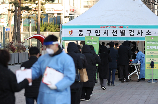 서울 중구 서울광장에 마련된 코로나19 검사 채취를 위한 중구 임시 선별검사소에서 시민들이 검사를 받기 위해 대기하고 있다.
