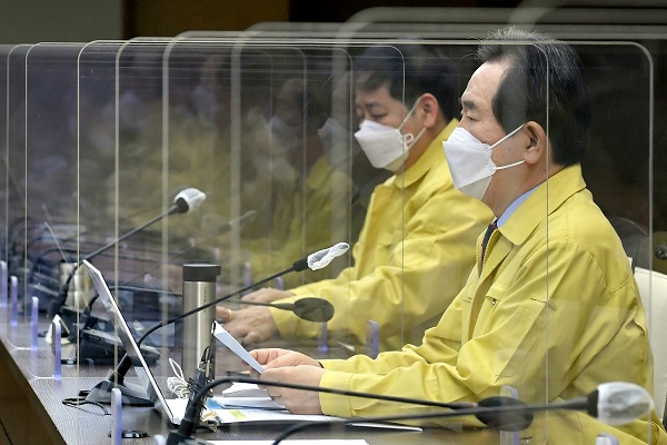 ▲ 정세균 국무총리가 9일 정부서울청사에서 열린 코로나19 중앙재난안전대책본부 회의에서 모두 발언을 하고 있다.정 총리는 “혹독한 3차 유행의 겨울을 견디며 힘겹게 쌓아온 방역의 둑이 봄바람과 함께 허망하게 무너지는 일은 결단코 없어야 한다”며 “기나긴 코로나19와의 싸움에서 이제는 확실한 승기를 잡을 수 있도록 언제 어디서든 거리두기와 마스크 쓰기 등 방역수칙 실천을 간곡히 요청드린다”고 당부했다.