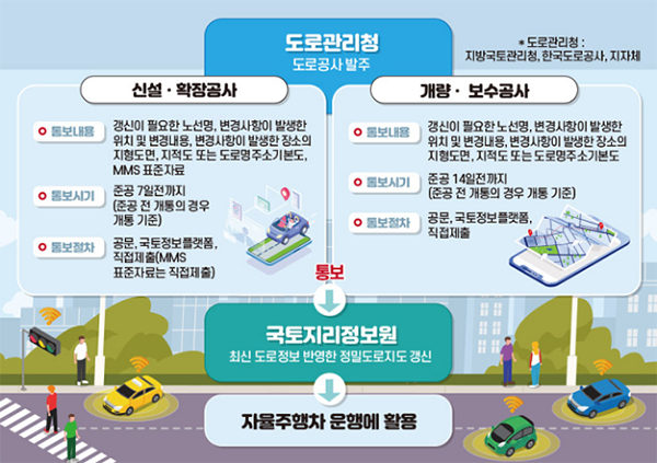 [일간환경연합 한선미 기자]앞으로는 신설·확장·개량·보수 등 도로공사가 마무리될 때 도로 변경 사항이 자율주행차 운행을 위한 정밀도로지도에 즉각 반영된다.