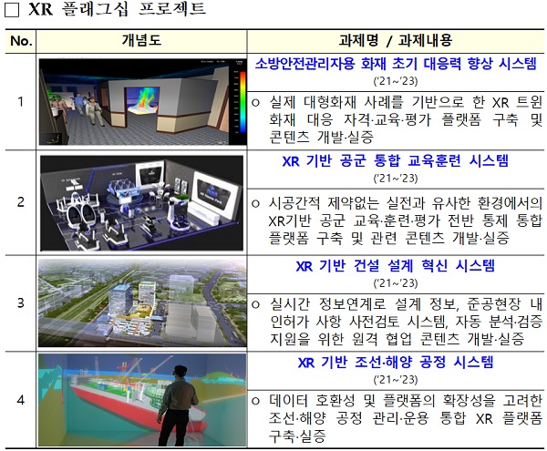 올해 신규로 ▲소방 안전관리자용 화재 대응 향상 시스템(소방) ▲XR 기반 공군 통합교육훈련 시스템(국방) ▲XR 기반 건설·설계 혁신 시스템(건설) ▲XR 기반 조선·해양 공정 시스템(조선) 등 4개 과제를 선정해 향후 3년간 과제별로 약 60억 원을 지원한다.