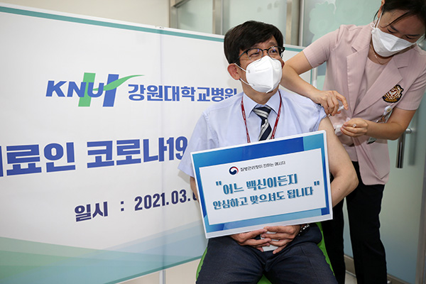 ▲ 이승준 강원대병원장이 8일 오전 병원 내 주사실에서 병원 1호로 코로나19 아스트라제네카 백신을 접종하고 있다.(사진=(c) 연합뉴스)예방접종전문위원회는 1차 접종 후 코로나19로 확진 받은 사람 및 아나필락시스 반응자에 대한 2차 접종에 대한 세부 실시기준에 대해서도 심의했다.