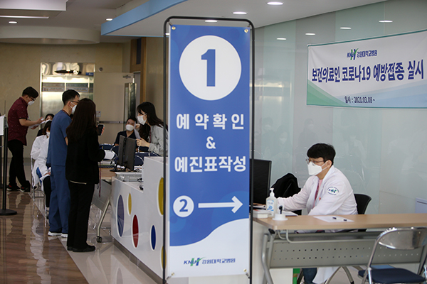 ▲ 8일 오전 강원대병원에서 의료진들이 코로나19 아스트라제네카 백신 접종순서를 기다리고 있다.(사진=(c) 연합뉴스)김 반장은 “판정한 4건의 사망사례는 모두 심혈관계, 악성신생물, 만성 폐쇄성 폐질환 등 기저질환으로 인한 사망 가능성이 높고, 사망에 이를 수 있는 심부전, 발작성 심방세동, 폐렴 등 추정원인·사망원인들이 확인됐다”고 말했다.
