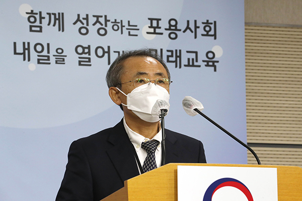 ▲ 강태중 한국교육과정평가원 원장이 16일 오전 세종시 정부세종청사에서 2022학년도 대학수학능력시험 시행 기본계획을 발표하고 있다. (사진=(c) 연합뉴스)강 원장은 “2022학년도 대학수학능력시험은 기본적으로 이미 2019년 8월에 교육부가 발표했던 기본계획에 맞춰서 준비해 오고 있다”고 밝혔다.