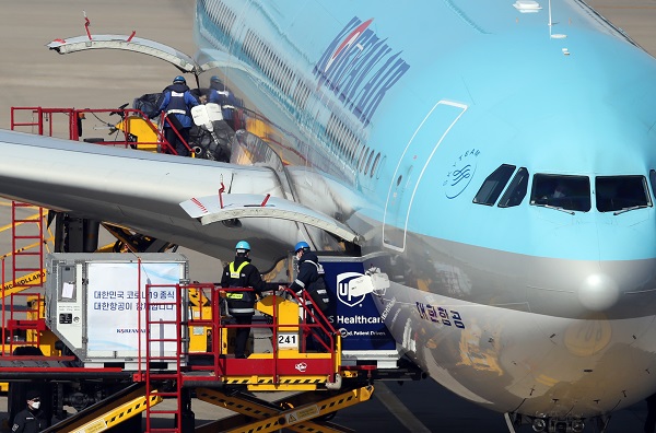 ▲ 지난달 26일 영종도 인천국제공항 화물터미널에서 국제백신공급기구인 ‘코백스 퍼실리티’를 통해 확보한 화이자 백신 초도 물량이 대한항공 화물기에서 내려지고 있다.(사진=(c) 연합뉴스)코백스 공급 아스트라제네카 백신은 3월 69만 회분과 4~5월 141만 회분에 대해 유니세프 측으로부터 네덜란드에서 각각 3월 31일과 4월 22일 운송 개시될 예정임을 통보받았다.