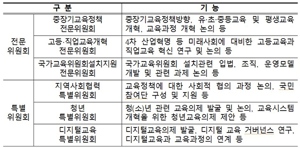 ▲ 전문·특별위원회 구성 내역김진경 국가교육회의 의장은 “제4기 국가교육회의에서는 국가교육위원회 설치를 통해 미래형 교육체제로의 전환을 지원할 수 있도록 국가교육위원회 설치 이후 다루게 될 교육의제, 운영방식 등에 대한 논의를 구체화할 것”이라고 밝혔다.