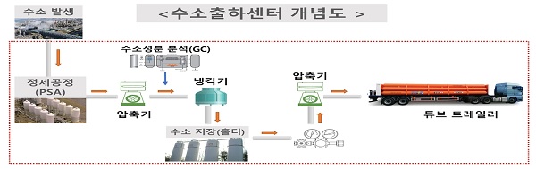 수소출하센터는 수소생산공장에서 생산된 수소를 저장 후, 수소 전용 특수차량인 ‘튜브트레일러’에 적재해 수소충전소에 공급하는 역할을 하는 곳이다.