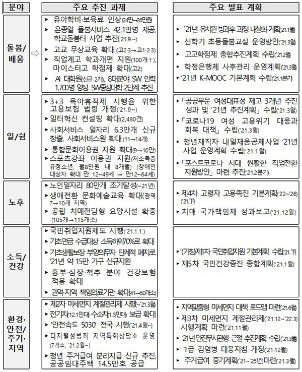 정부는 올해도 돌봄, 배움, 일, 쉼, 노후, 소득, 환경·안전, 건강, 주거·지역 등 9개 영역에 따른 ‘포용국가 사회정책 추진계획’을 지속적으로 추진할 계획이다.