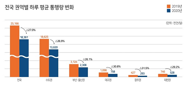 하루 평균 교통카드 이용 건수는 전국 평균 27.0% 감소했으며, 권역별로는 광주권이 31.5%로 감소폭이 가장 컸고 대구권 30.8%, 대전권 29.2%, 수도권 26.9% 순이었다.