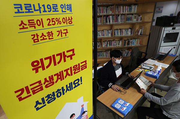 ▲ 지난해 10월 코로나19로 인한 실직, 휴·폐업 등으로 소득이 25% 이상 감소했지만 다른 피해 지원 프로그램을 받지 못해 어려움을 겪는 저소득층에 지급된 긴급생계지원금 현장 접수처. (사진=(c) 연합뉴스)복지부는 기존 복지제도나 코로나19 대응 맞춤형 지원 프로그램의 혜택을 받지 못하는 사각지대 저소득층 80만 가구에 한시적 생계지원금 50만원을 지급한다.