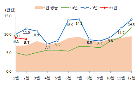 [일간환경연합 장미누 기자]국토교통부는 2월 주택 매매거래량은 총 8만 7021건으로 전월(9만 679건)에 비해 4.0% 줄었다고 26일 밝혔다.