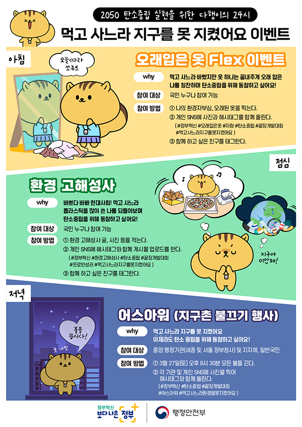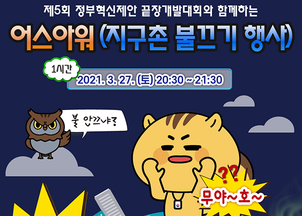 [일간환경연합 장민주 기자]행정안전부가 탄소중립 실현을 위한 ‘어스아워(Earth Hour)’ 행사에 동참하며 제5회 정부혁신제안 끝장개발대회 도전과제를 선포한다.
