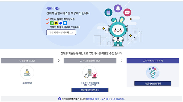 [일간환경연합 장민주 기자]75세 이상 백신접종이 시작되는 4월부터 백신접종 대상자가 접종예약 신청과정에서 ‘국민비서’ 서비스를 함께 신청하면 원하는 모바일 앱(네이버앱·카카오톡·토스) 또는 문자메시지로 안내받게 된다.