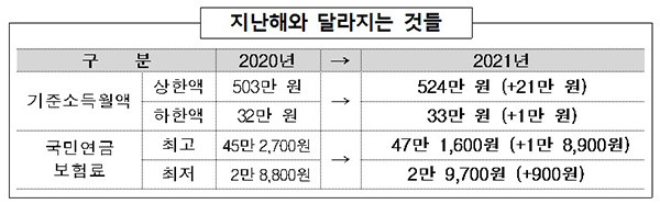 한편 상·하한액 조정으로 일부 가입자의 보험료가 인상됨에 따라 연금급여액 산정에 기초가 되는 가입자 개인의 생애 평균소득월액도 높아져 연금수급 시 더 많은 연금급여액을 받게 된다.