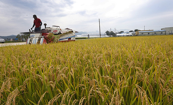 ▲ 강원 춘천시 우두동 논에서 농부들이 누렇게 익은 벼를 추수하고 있다.(사진=(c) 연합뉴스)이번 바우처 지원은 소농직불금을 지급받았던 대상자의 71%가 65세 이상 고령농인 점을 감안해 영세 고령농에 대한 폭넓은 지원을 한다는 의미가 있다고 농식품부는 설명했다.