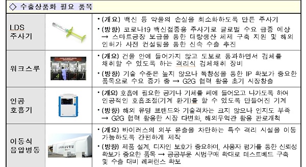 이를 위해 중동·아프리카·CIS·중남미 등 신흥 유망시장을 대상으로 집중 수요발굴 및 방역물품 ODA 등을 통한 수출을 촉진한다.