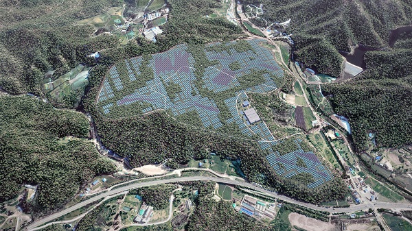 ▲ 하늘에서 바라본 강원도 철원 두루미 태양광발전소 모습.(사진=레즐러) 올해부터는 공장, 물류창고 등의 경우 희망 설치용량이 큰 점을 감안해 건물 태양광 보조금 지원 용량을 기존 50kW에서 200kW까지 상향 조정했다.