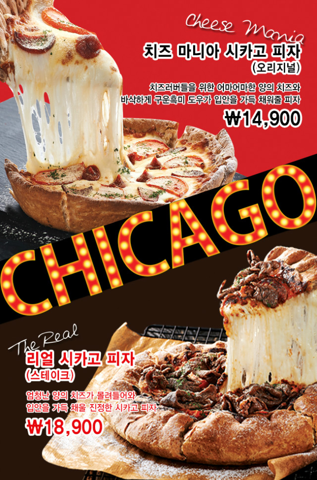 유쾌한 식감이 특징으로 꼽힌다. 여기에 오리지널, 불갈비스테이크, 핫치킨 토핑을 선택해서 다양한 맛으로 시카고피자를 즐길 수