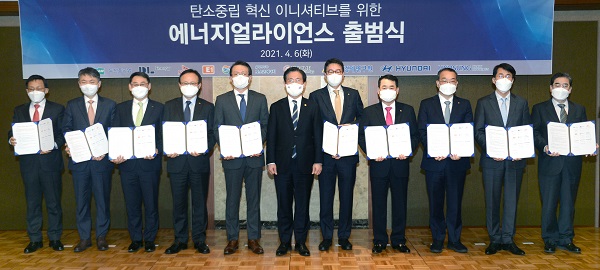 ▲ 2050 탄소중립 이니셔티브 실현을 위한 에너지 얼라이언스 출범식이 6일 서울 중구 롯데호텔에서 열렸다. (사진=산업통상자원부)에너지 얼라이언스는 세계 탈 탄소 흐름에 맞춰 정책에 공동 대응하고 사업 전략을 함께 고민한다는 취지로 올해 초부터 주요 민간 에너지 기업이 모여 논의한 끝에 탄생했다. 국내 민간 에너지 기업이 탄소중립과 관련해 자발적인 공동체를 만드는 것은 이번이 처음이다.