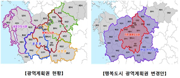 행복도시 광역계획권은 지난 2006년 처음 대전시, 연기군, 공주시, 계룡시, 청주시, 청원군 등 9개 시·군(3597㎢)이 지정된 이후 세종특별자치시 출범 등 정책여건 변화 반영 필요성과 다른 광역계획권(대전권, 청주권, 공주역세권)과의 중첩으로 인한 비효율 문제가 계속 제기돼 왔다.