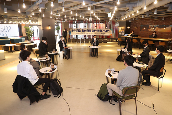 ▲ 강성천 중기부 차관이 지난달 25일 서울 강남구 팁스타운에서 열린 청년 스타트업 간담회에서 참석한 청년창업자들과 대화를 나누고 있다.(사진=중소벤처기업부)사업은 코로나 이후의 시대를 이끌 비대면 분야 유망 창업기업을 신속하게 발굴·육성하기 위해 중기부가 올해 신설한 사업이다.