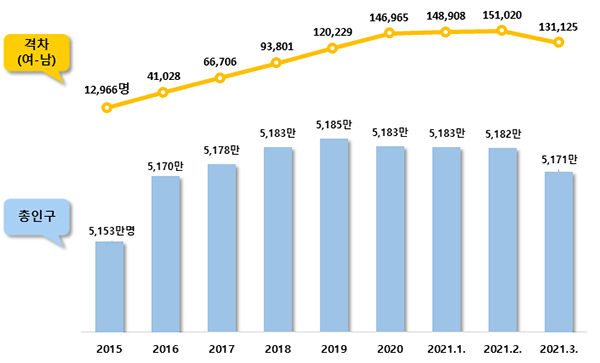 행안부는 국가통계 조사결과 3월 말 기준으로 주민등록인구는 5170만 5905명으로, 지난해 12월 31일 5182만 9023명에 비해 12만 3118명이 줄었다고 7일 설명했다.