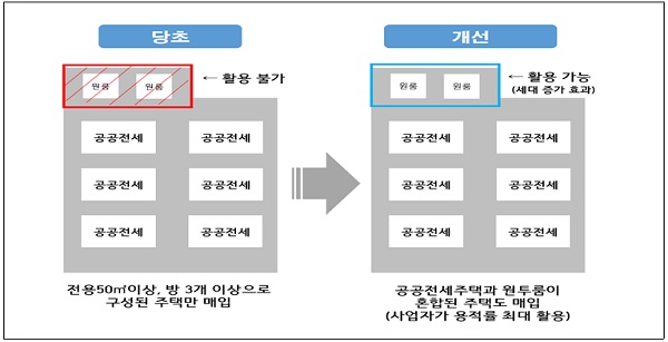 기존에는 건물 내 모든 세대가 공공전세요건(방3개 이상, 50~85㎡)에 해당하는 경우에만 LH 등이 매입해왔으나, 앞으로는 공공전세주택과 원·투룸이 혼합된 주택도 매입한다.